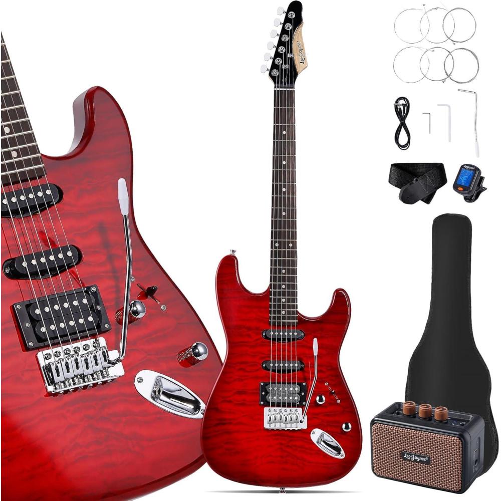imageLeo Jaymz Beginner Electric Guitar Complete Kit with Portable Amp Padded Gig Bag ampamp Full Accessories Maple Neck SSS PickupsWhiteBlack FadeRed Flame 5W